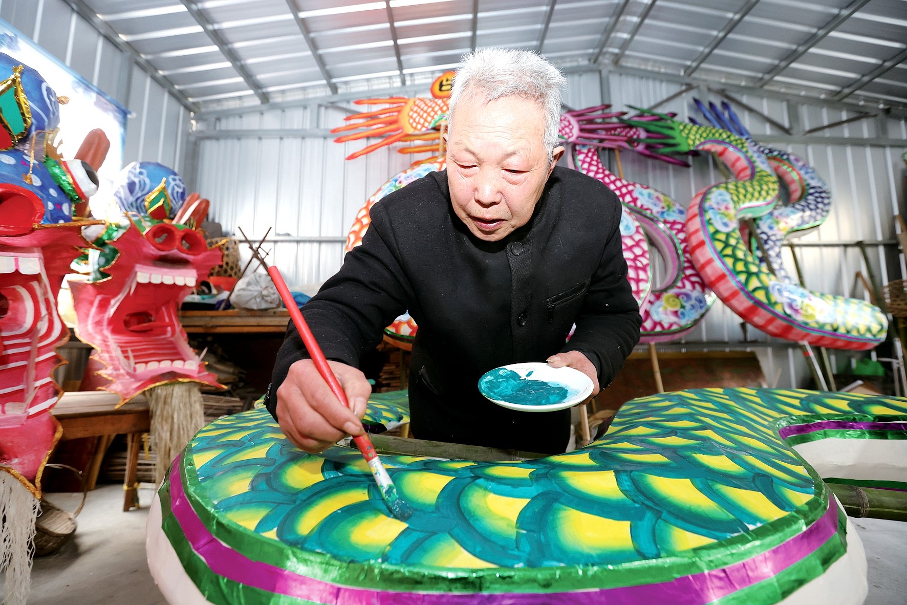 见到丁广禄的时候,他正在工作间里忙碌着。“我现在正在给火龙的胡子贴金,这条火龙是给军店镇做的,他们要的是黄龙,今天把龙头龙尾完成好,明天就可以拿走了。”