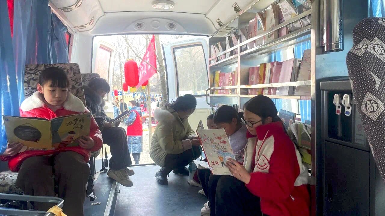 近日,窑淮镇的孩子们在流动图书车上阅读书籍。在县图书馆开展的送书下乡活动中,主要以特色民俗及生肖系列的春节主题图书、绘本为主,深受孩子们的喜爱,旨在丰富他们的精神文化生活,为新春佳节增添浓厚的文化氛围。