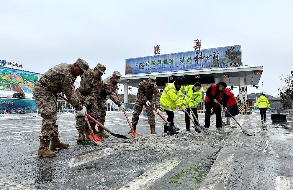 城关镇组织民兵、志愿者在高速公路房县收费站出入口开展扫雪铲冰工作。(李硕 许拯 摄)