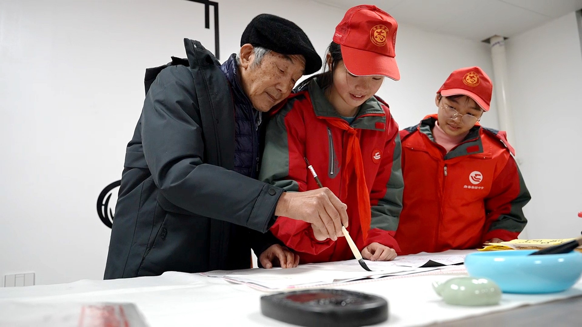 实验中学教联体学生到县光荣院与老人一起练习书法。(任姗姗 摄)