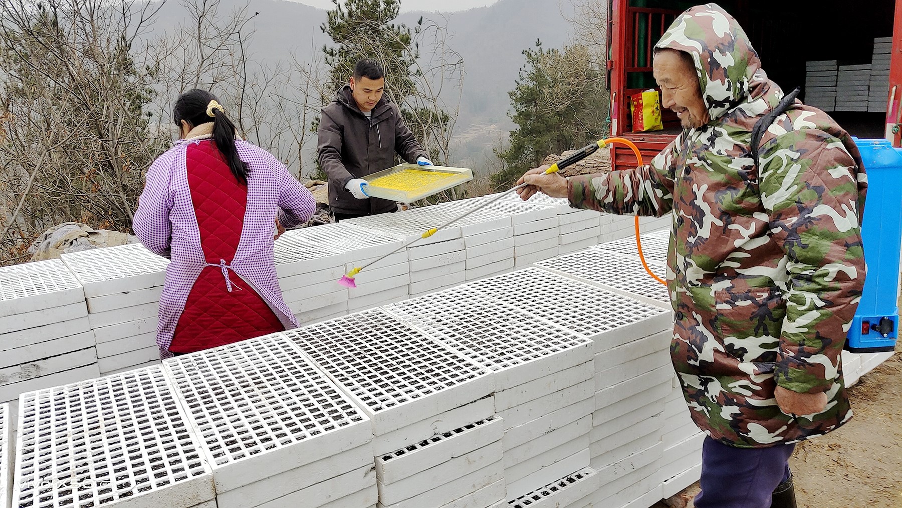 近日,沙河乡鹰嘴石村村民抢抓当前播种育苗关键时期进行烟叶育苗,在育苗期间,严格育苗池杀虫消毒处理、苗床温湿度管控等,精心呵护烟苗,确保苗齐、苗壮、苗足。(郭宝添 摄)