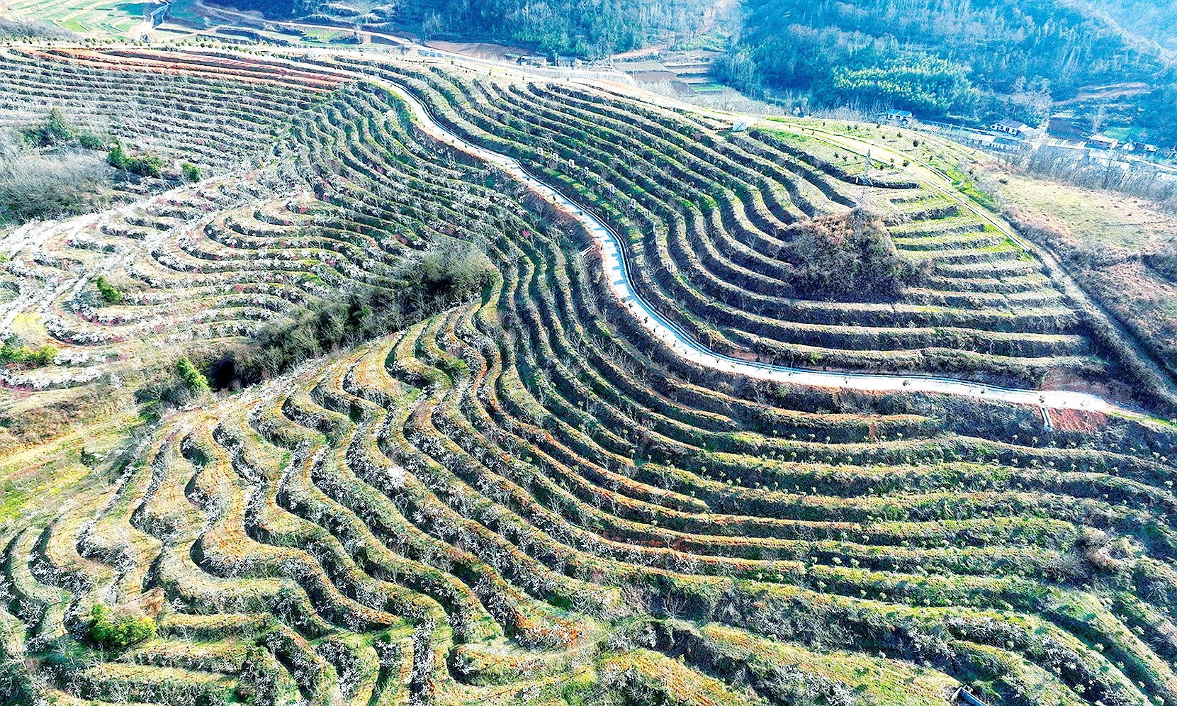 近日,在军店镇中村白鹤湾小流域山丘岗上樱桃花、桃花、油菜花竞相绽放。近年来,我县实施小流域水土保持“山水林田路”综合治理,在治理后的荒山荒坡发展核桃、樱桃、茶叶等产业,将65万亩荒山变成果茶药飘香的“金山”。