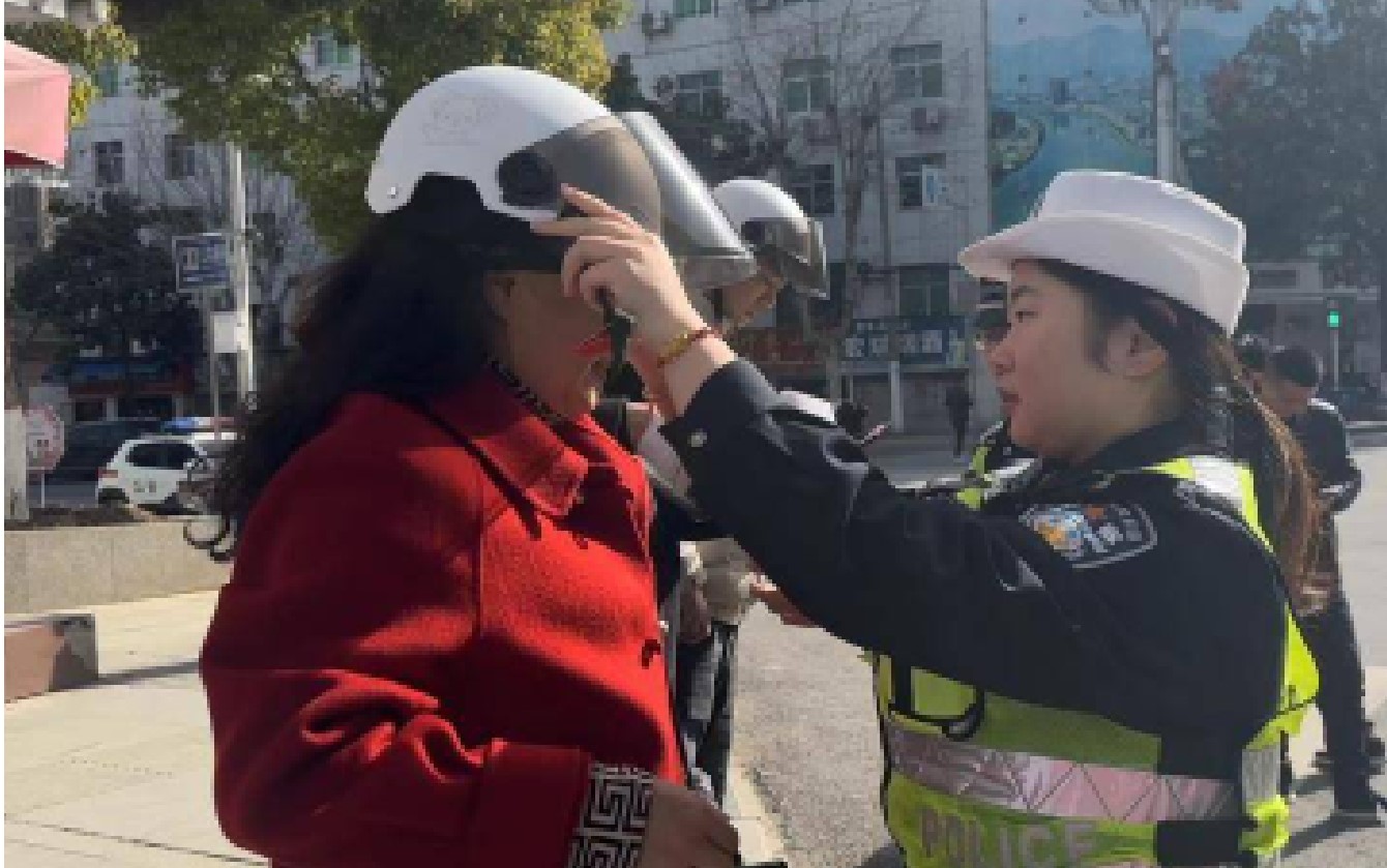 近日,交警为电动车驾乘人员佩戴赠送头盔。在县交警大队开展的“护安全 赠头盔”活动中,交警对骑乘摩电车加装雨篷、不戴头盔等行为及时拦停,引导大家自觉抵制各类交通违法行为,争做文明交通新风尚的宣传者、践行者。
