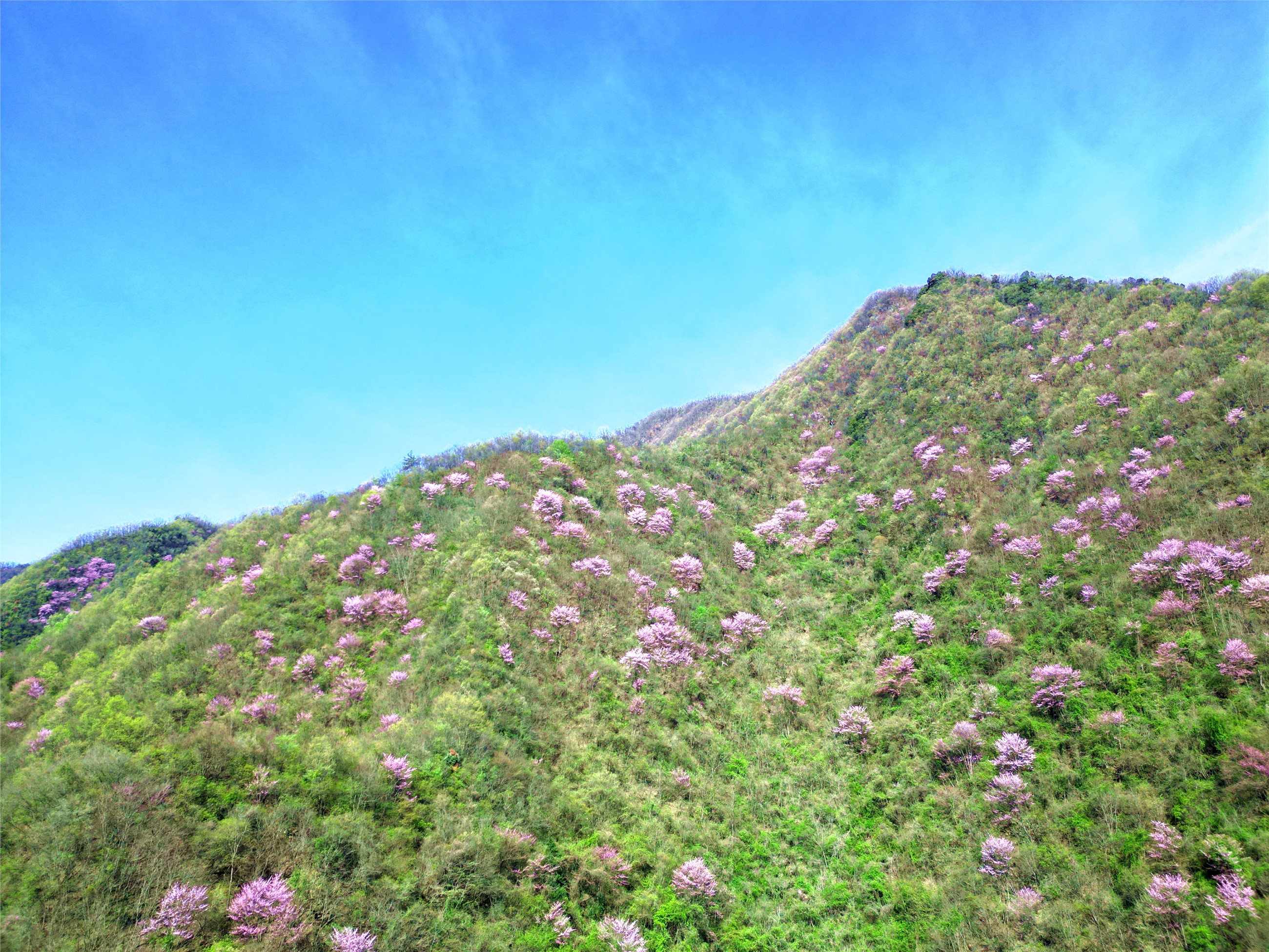 近日,在野人谷镇十回首漫山遍野的巨紫荆花迎春绽放。粉红色的紫荆花在山坡、峡谷间肆意盛开,一枝枝、一匝匝如一群群翩跹起舞的彩蝶,相互簇拥形成花的海洋。