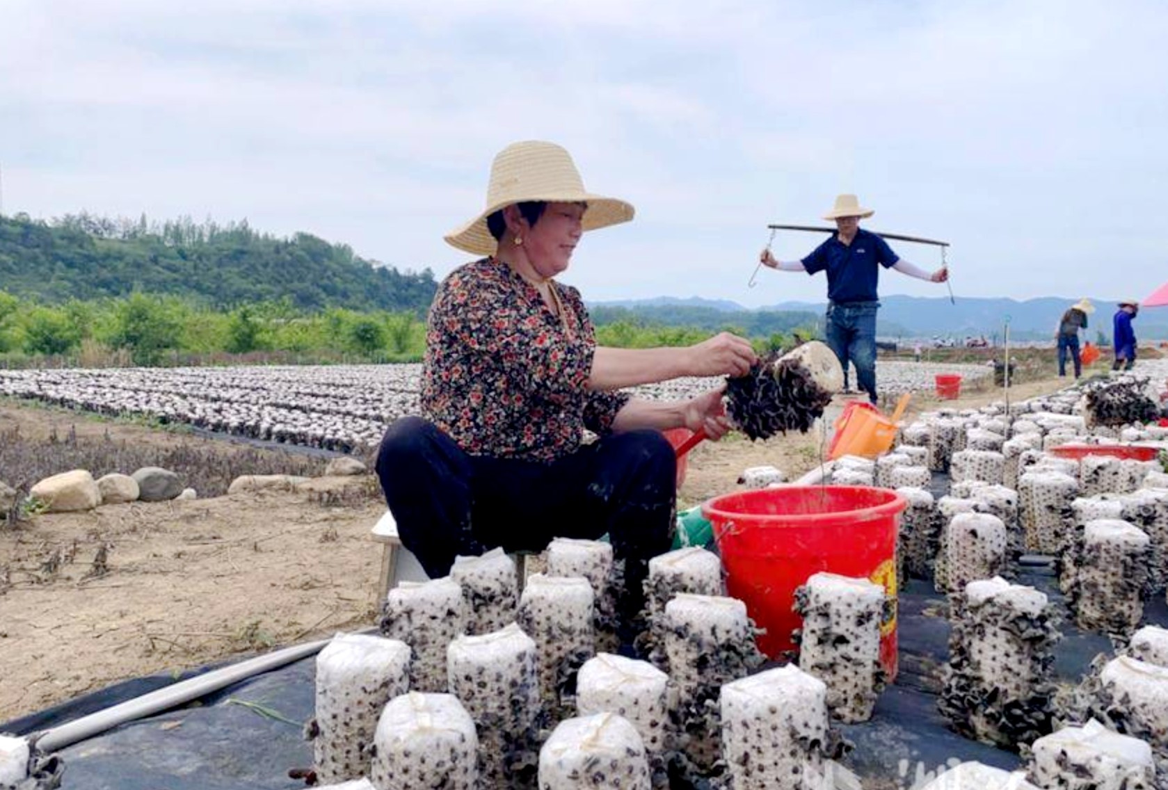 近日,在军店镇向家湾村木耳种植基地农户正在采摘木耳,处处洋溢着丰收的喜悦。军店镇探索“党支部+合作社+基地+农户”的模式发展木耳100多万棒,小小菌棒成为富民增收的“接力棒”。(谢鸽 摄)