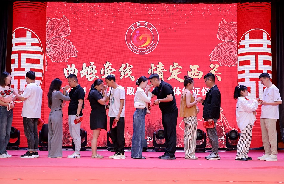 5月20日,12对新人在西关印象进行集中领证。县民政局举办520婚恋婚俗特色宣传活动,为新人们带来全新婚姻登记体验的同时,开展婚事新办,喜事简办,抵制高价彩礼等文明婚俗宣传,引导群众知新风、树新风、赞新风。(王炯尧 郭丽萍 摄)