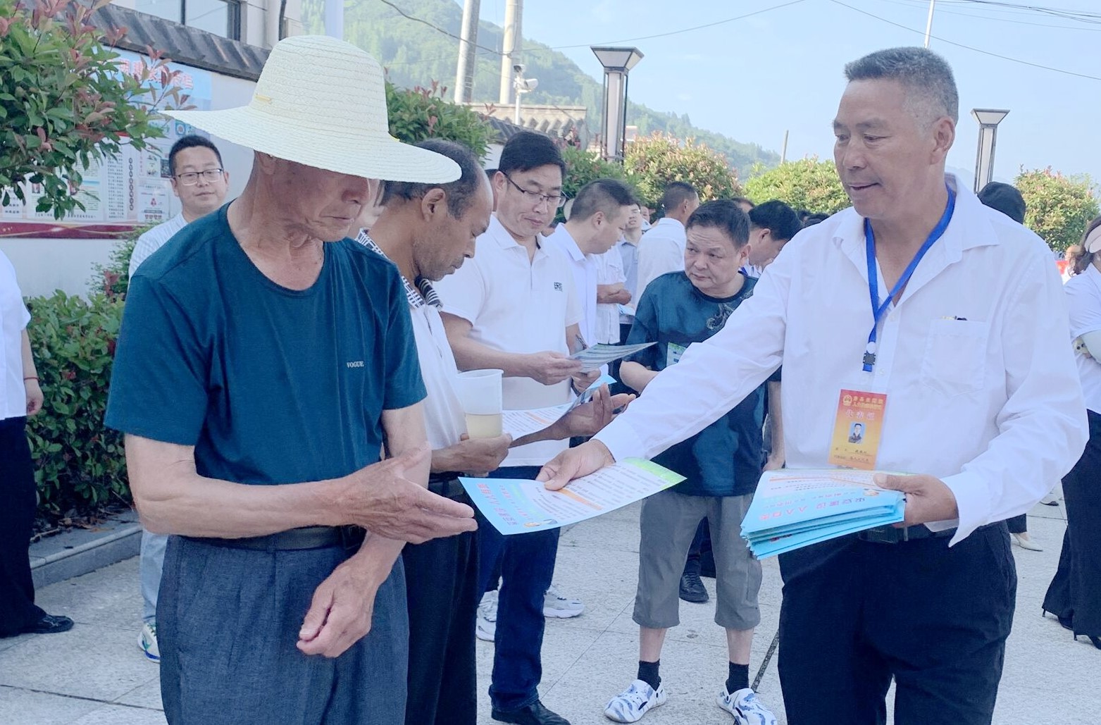 近日,白鹤镇组织人大代表进村入户向群众发放宣传彩页,宣讲防范非法集资知识和扫黑除恶等知识,提高人民群众参与平安建设、法治建设的积极性和主动性,使平安建设深入人心。(王林锒 摄)