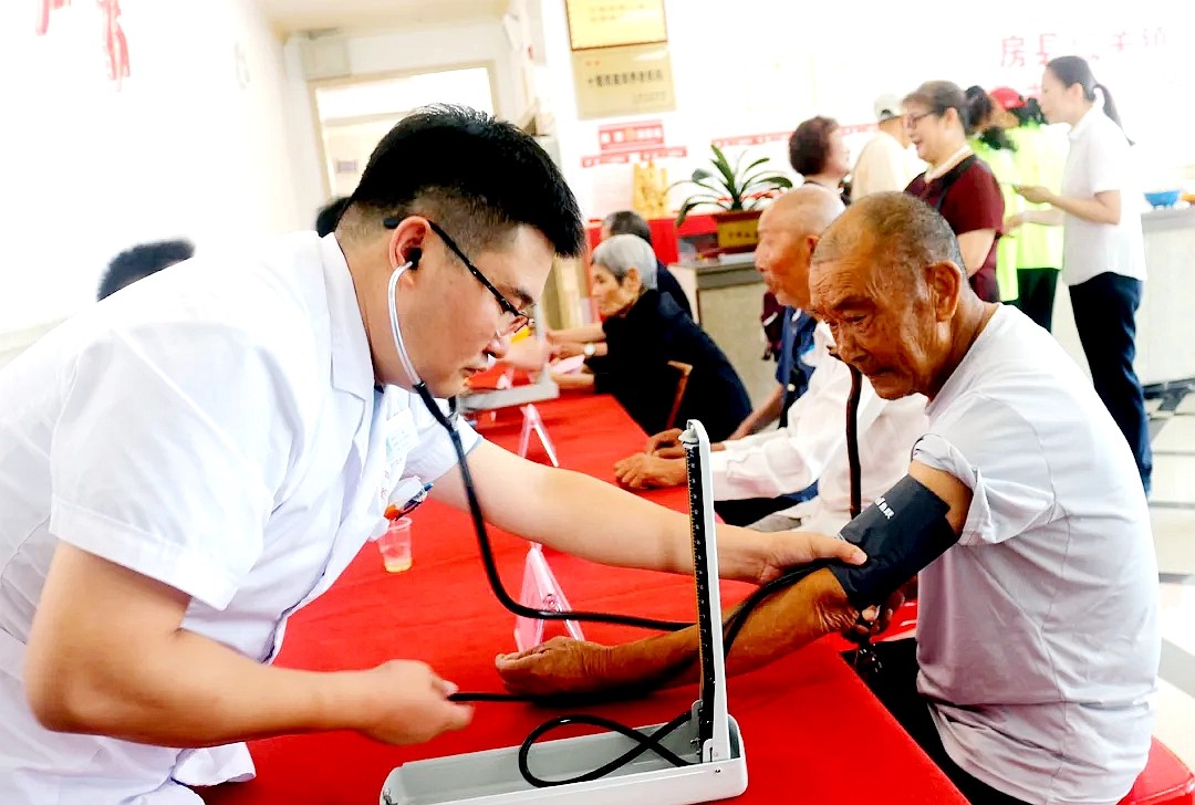 近日,县人民医院组织医护人员到南乡里颐养院开展健康体检活动。医护人员通过为老人做健康检查、询问他们的身体情况等,针对性地指导他们强化自我健康管理、合理科学用药,全面提高健康素养。(裴中东 屈振坤 摄)