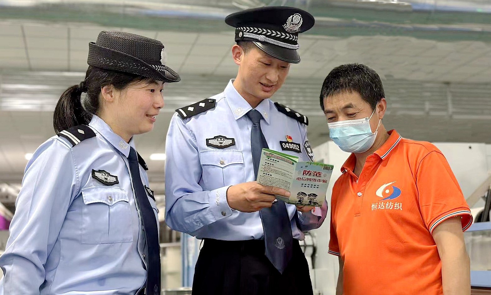 近日,县公安局经侦大队民警走进企业讲解防范金融风险注意事项。今年以来,该局积极推进落实“两书一单”工作机制,以企业自治与执法监督相结合的方式对企业进行全面“体检”,协助企业规避风险、健康发展。 (祁晓斌 摄)