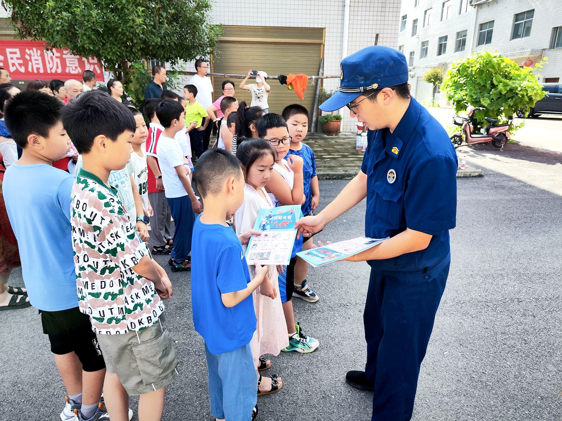 近日,县消防救援大队的消防员在城关镇祥和小区给孩子发放消防安全宣传册。在该部门开展的消防安全教育活动中,消防员们向孩子讲解防火常识及如何自救等知识,进一步普及消防安全知识,提升他们的自防自救能力。(彭磊 摄)