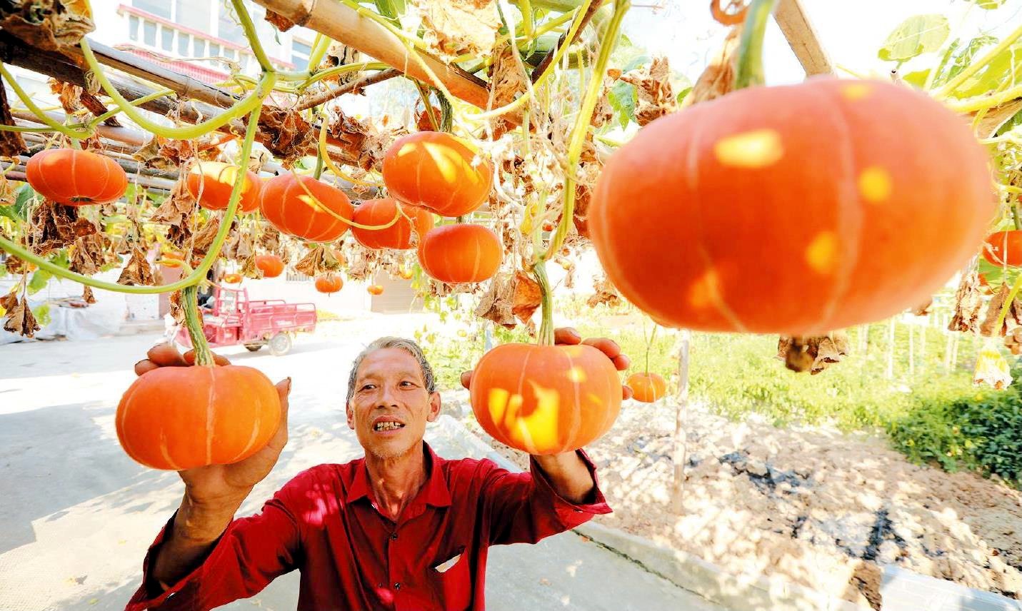 近日,在军店镇向家湾村农家庭院,金灿灿的小磨盘南瓜挂满棚架,个个硕大圆润,甚是喜人。近年来,该镇引导村民利用自家庭院或房前屋后空地,采取棚架方式种植小磨盘南瓜,既拓宽了增收渠道,也为乡村增添了微景观。( 张启龙 摄)