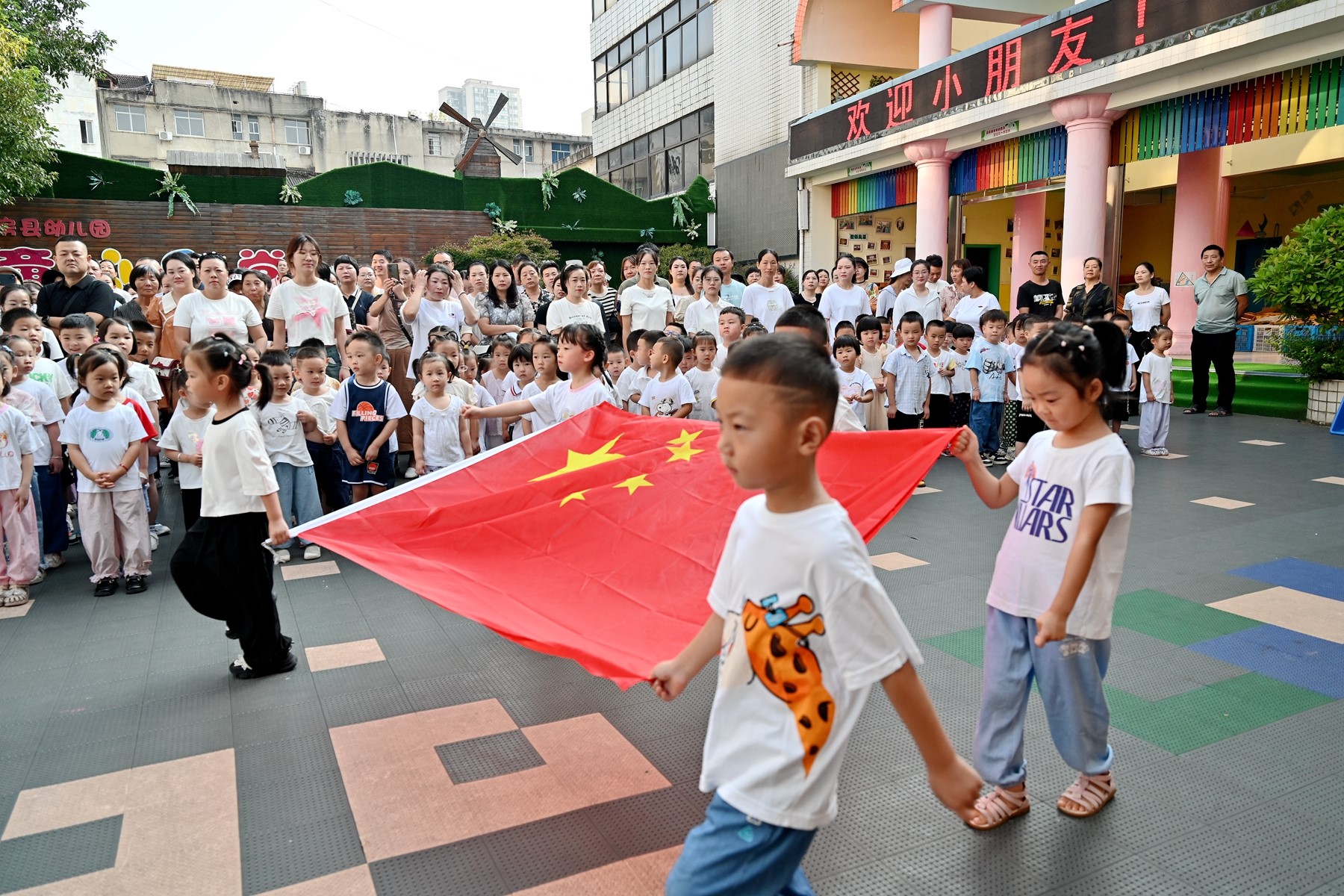 县幼儿园的幼儿们正在进行升旗仪式。该幼儿园通过举办安全教育、签到打卡、拍照合影等形式多样的活动,让幼儿体验充实而又有趣的开学之旅,共同促进德智体美劳全面发展。(彭招英 摄)