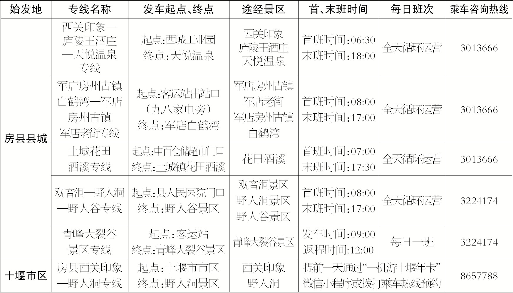 此次加开的6条旅游交通专线,覆盖西关印象、庐陵王酒庄、天悦温泉、军店房州古镇白鹤湾及军店老街、花田酒溪、观音洞、野人洞、野人谷以及青峰大裂谷等十个重点景区、景点。此次旅游交通专线的开通将极大地缓解旅游旺季的交通压力,为广大游客提供更加便捷、舒适的出行选择。