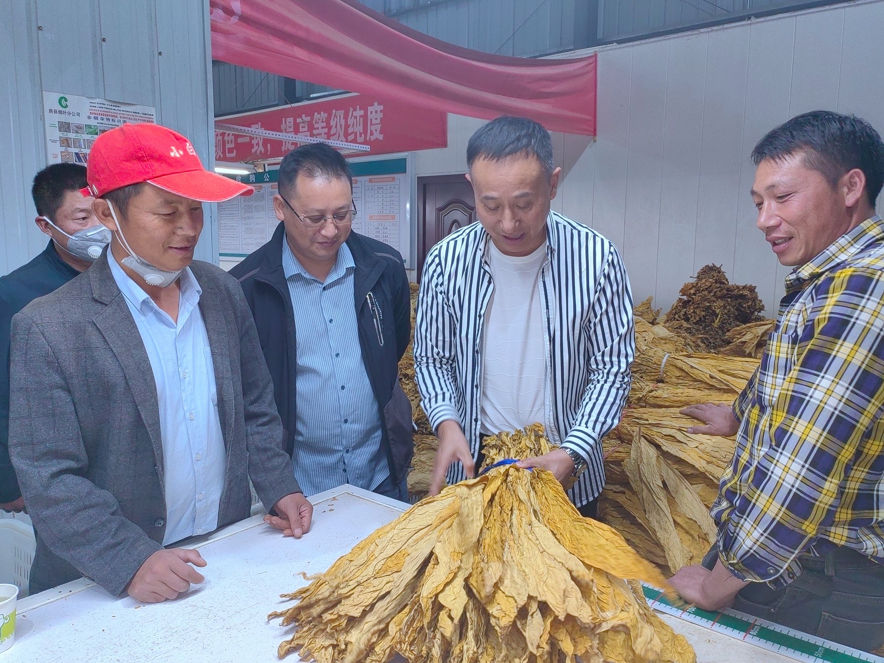 近日,在中坝乡烟站技术员正在对烟农送来的烟叶进行定级。今年该乡烟叶种植面积3000亩,收购烟叶7000担,一片片“金叶子”变成烟农手中的增收致富“红票子”。(明安祥 摄)
