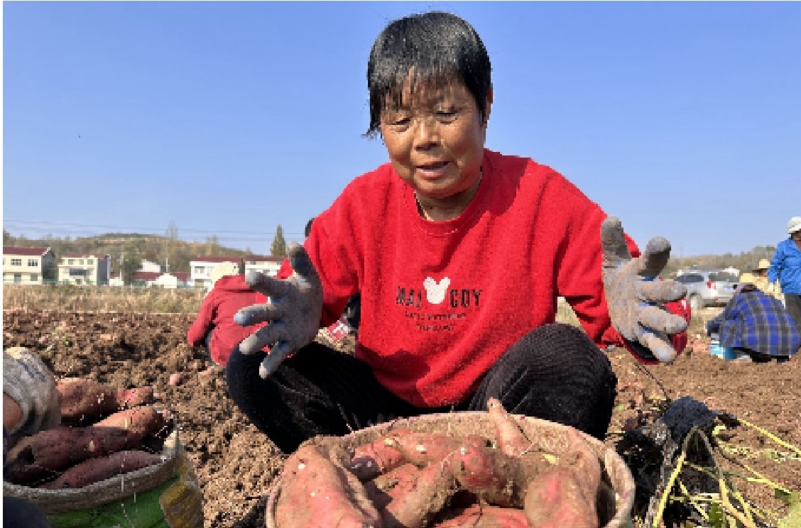 村民在地里分拣红薯