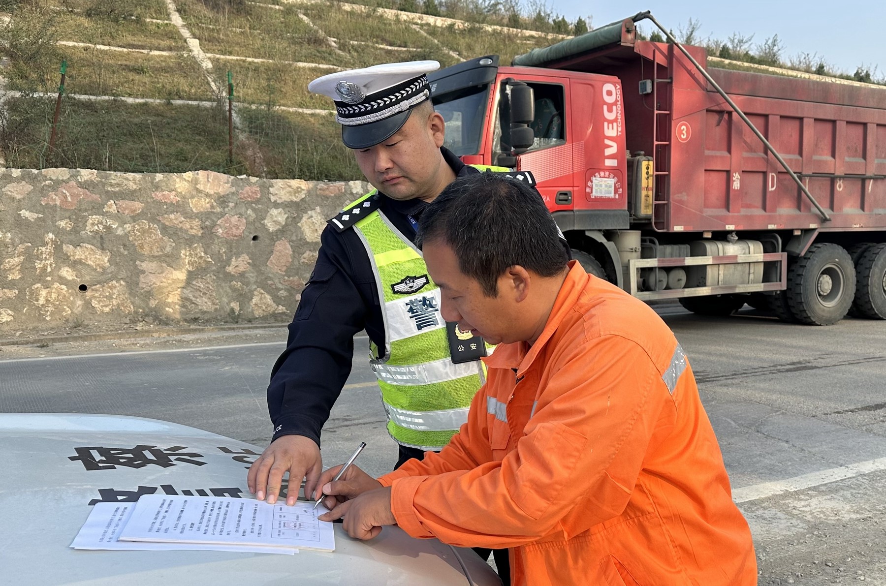 近日,县公安局交警大队四中队组织民警对辖区过往运输车辆进行安全检查,与驾驶员签订安全行驶责任书,提醒驾驶员安全文明出行,共同维护良好道路交通秩序。(贾馥宇 摄)
