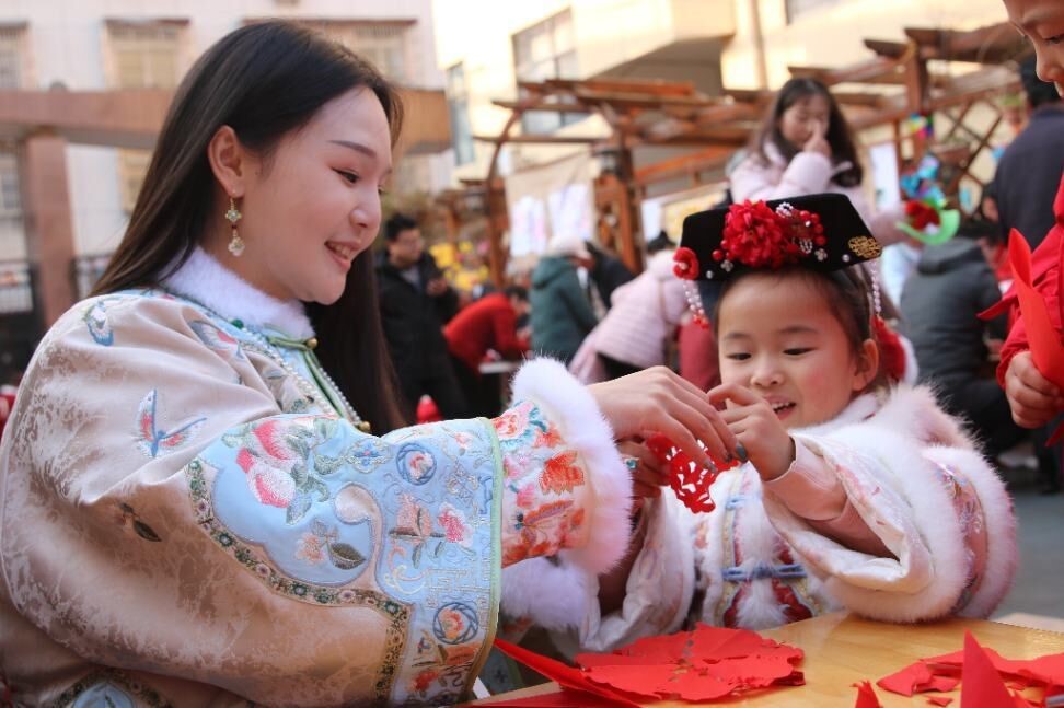 县幼儿园的幼儿在家长带领下,通过参与猜灯谜、剪窗花、投箭入壶、写福字、套圈、传统小吃制作等民俗文化亲子游园活动,让幼儿感受传统文化的魅力,增进亲子间的情感交流。
