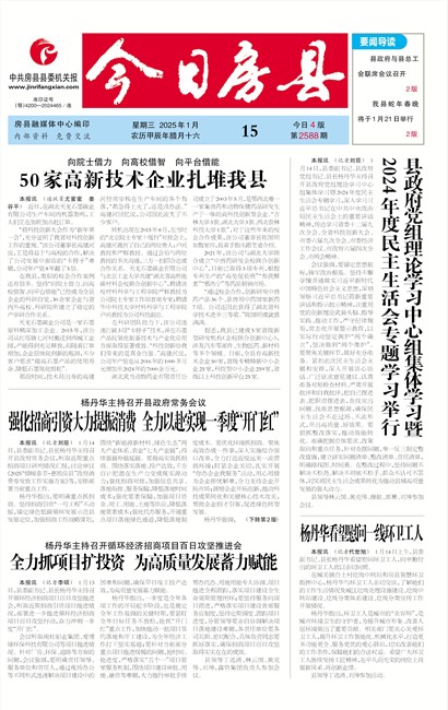 今日房县要闻 50家高新技术企业扎堆我县 强化招商引资大力提振消费  全力以赴实现一季度“开门红” 全力抓项目扩投资  为高质量发展蓄力赋能 县政府党组理论学习中心组集体学习暨2024年度民主生活会专题学习举行 杨丹华看望慰问一线环卫工人
