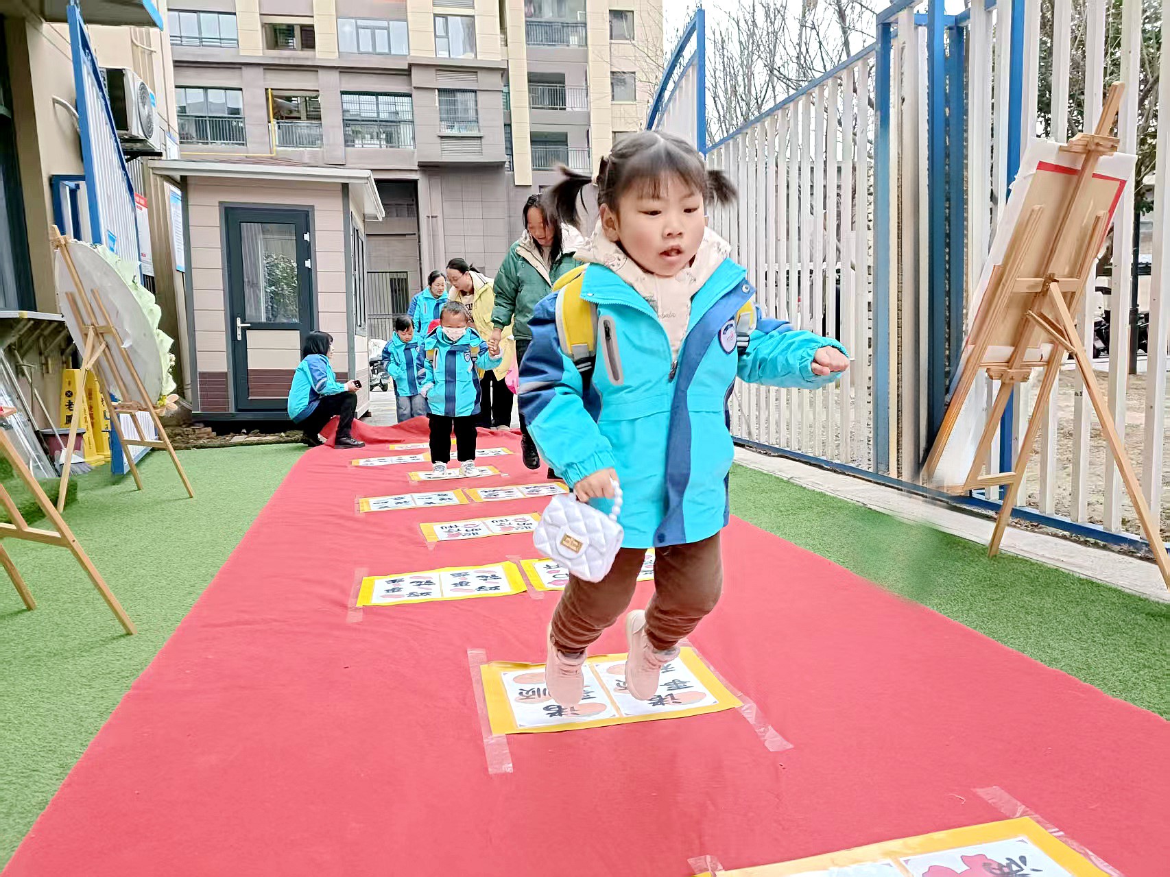 嘉卉幼儿园的幼儿正在欢乐地跳格子。孩子们跳过一道道寓意吉祥的格子,带着老师和爸爸妈妈的祝福,走进幼儿园,开启新学期的美好篇章。(杨娥 摄)