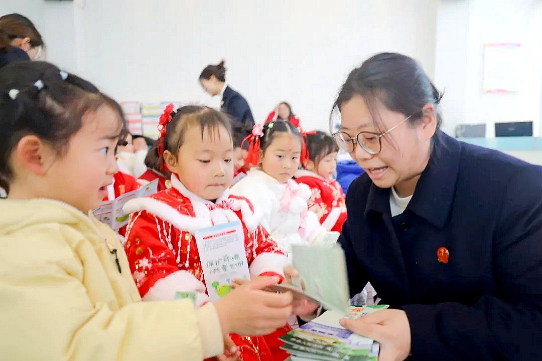 近日,县法院到县幼儿园开展法治课堂进校园活动。干警通过播放法治动画视频、设置互动体验等形式,对预防校园欺凌等法律知识展开讲解,提升幼儿的法治意识,全力护航他们健康成长。(戢颍欣 摄)