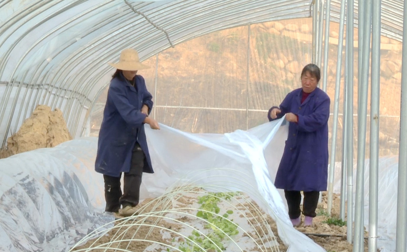 “我们这儿有三十多个人,每天干9个小时,干了将近快一个月了,覆膜就是为了保证温度,现在温度不到嘛,早晚的温差很大,覆上膜保证这个苗的成活率高。”白鹤镇赤岩村村民郭乐秀一边和同伴给瓜苗覆膜,一边跟记者介绍。