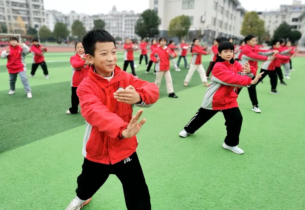 近日,东城小学学生在体育课上学打太极。今春开学以来,该校将课间休息时间由10分钟延长至15分钟,每天开设1节体育课,鼓励孩子们走出教室、走向户外,尽情享受运动带来的乐趣。