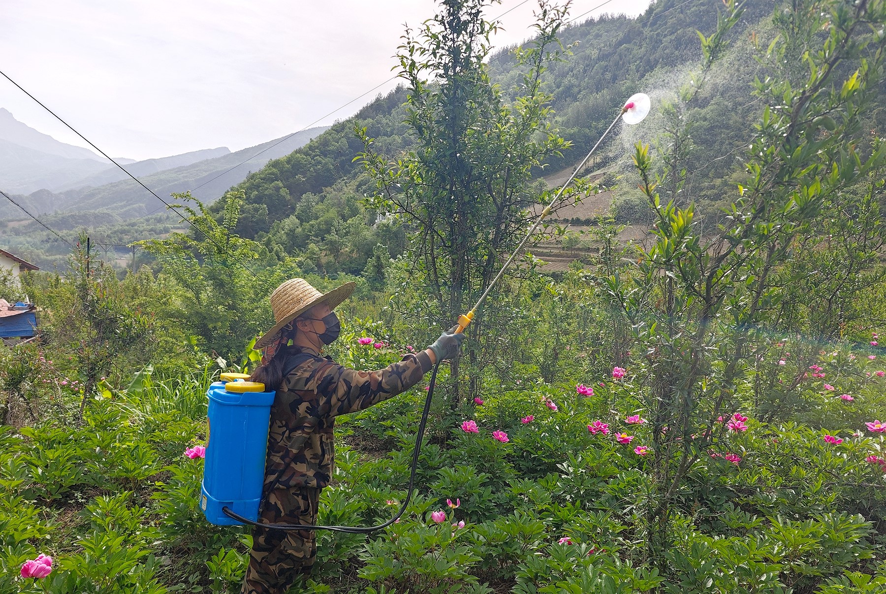 村民在芍药基地进行芍药病虫害防治工作