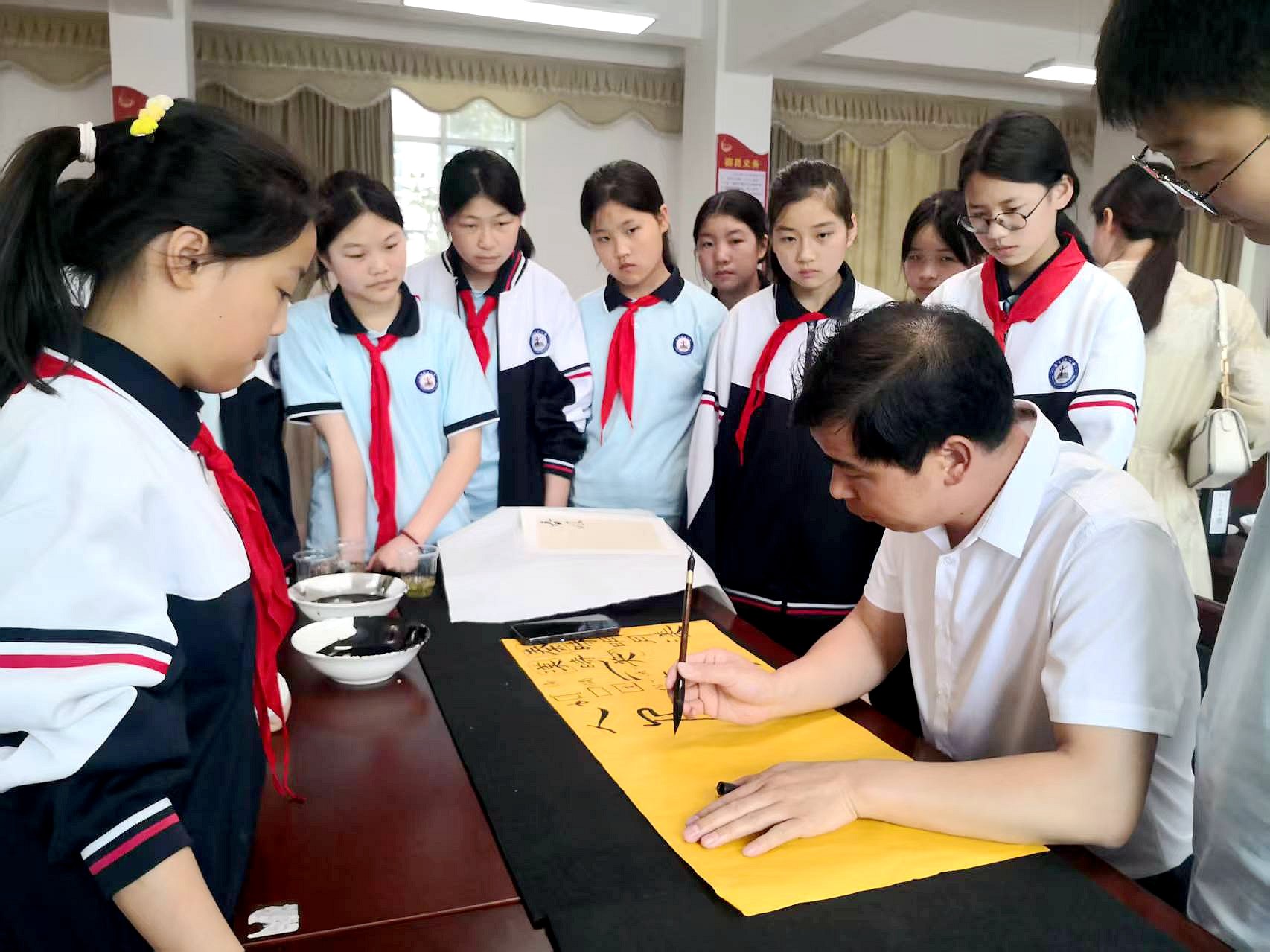 近日,县文联、团县委、县书协等联合到城关一中举办第二届“穆清杯”中学师生书画展。艺术家们现场挥毫泼墨,创作一幅幅精彩的书画作品,并向学生分享创作经验和技巧,让学生近距离感受书画艺术的魅力,进一步激发他们的创作灵感。(余睿晓 张立林 摄)