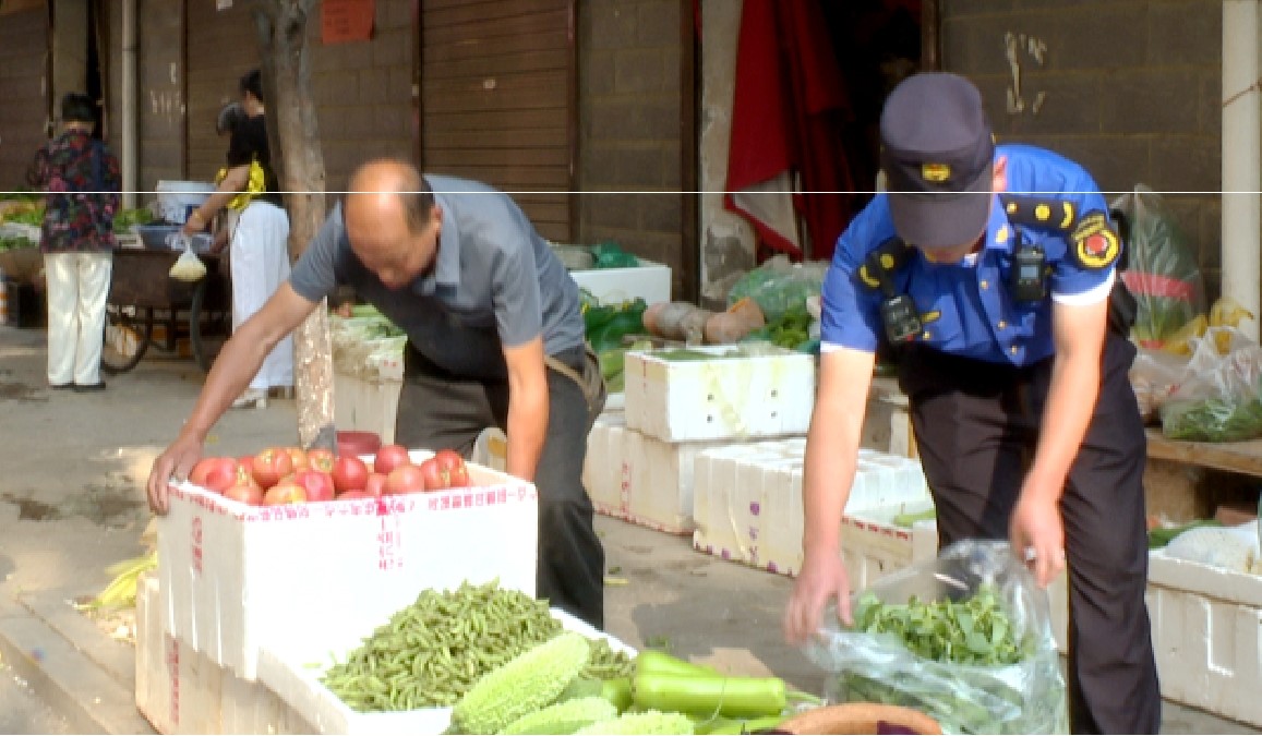 城管执法人员对摊贩摆摊占道经营行为进行劝导纠正。