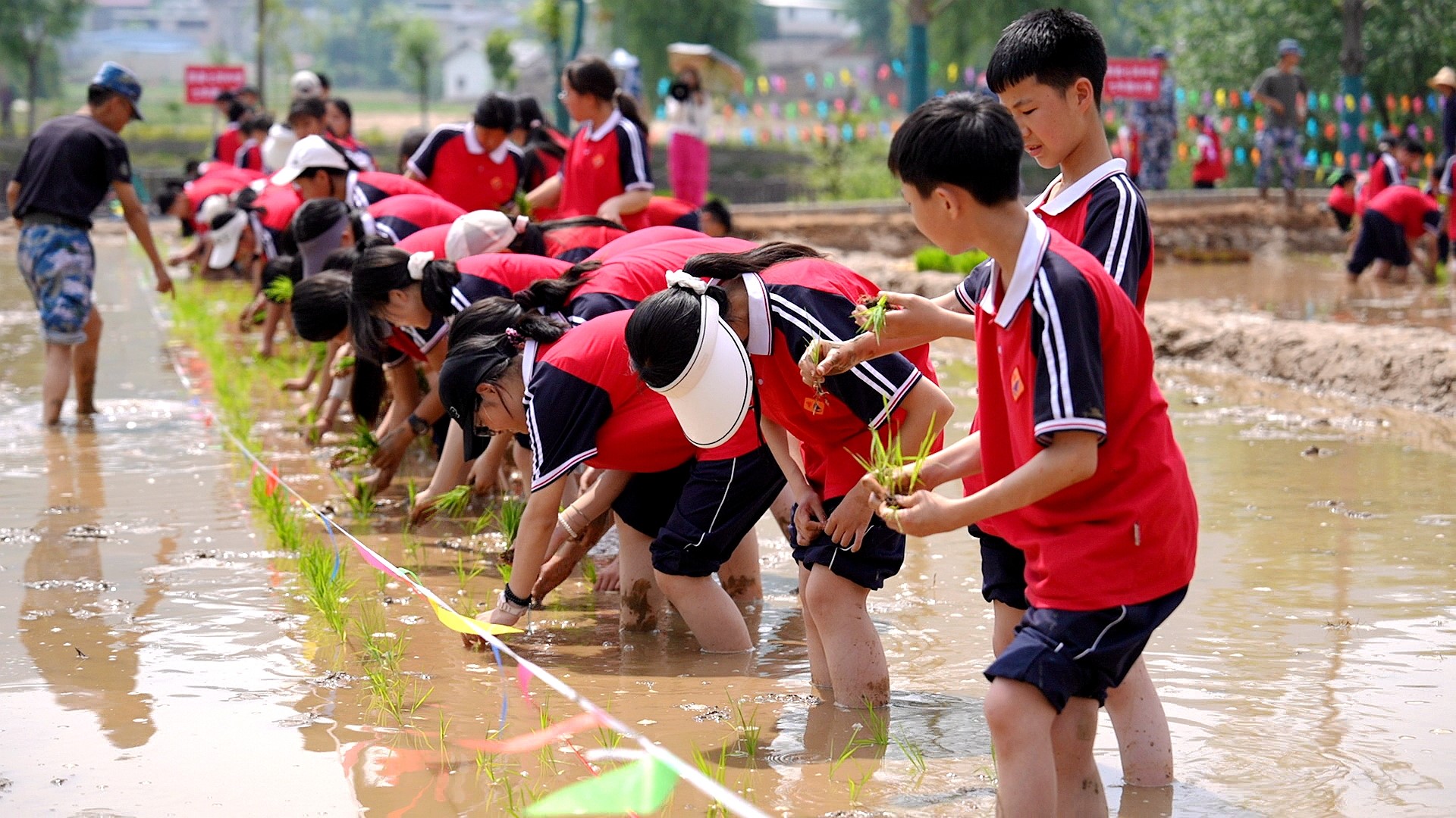 近日,七河中学组织学生到神农兔乐园生态稻田开展农耕研学活动。学生通过聆听水稻生长过程的讲解、学习插秧技巧,在体验中感受农耕文化的乐趣,提升他们的劳动实践能力。(绳晓 周健婷 摄)