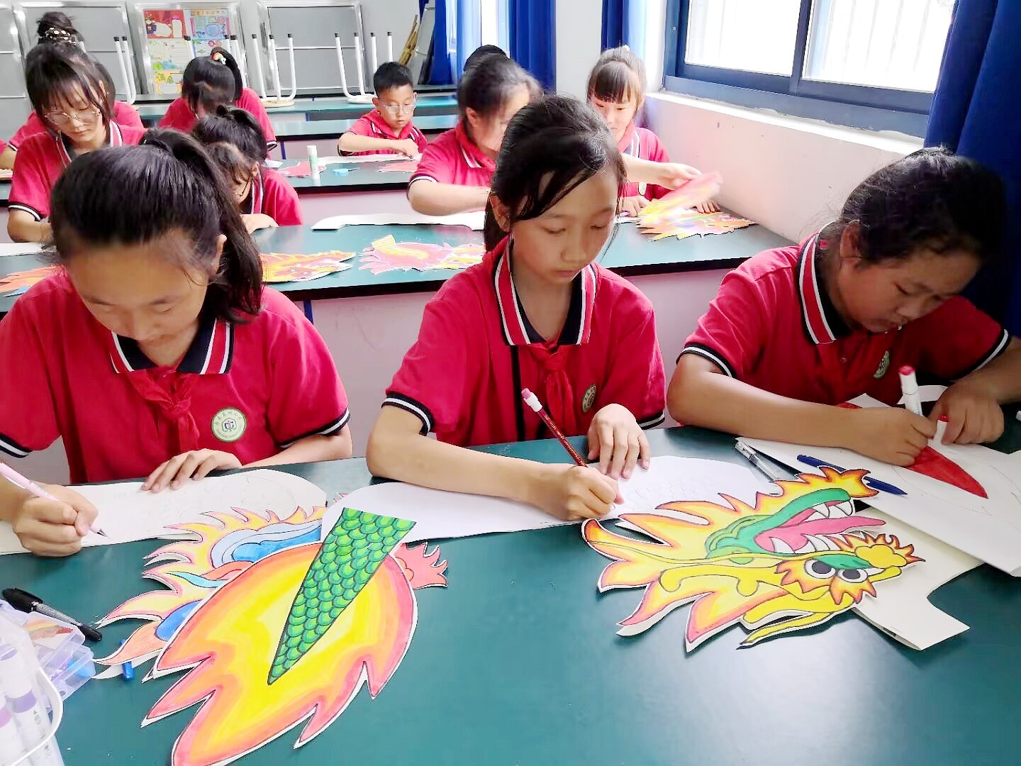 东城小学学生正在绘制形态各异的龙舟。(李英 邓红艳 摄)