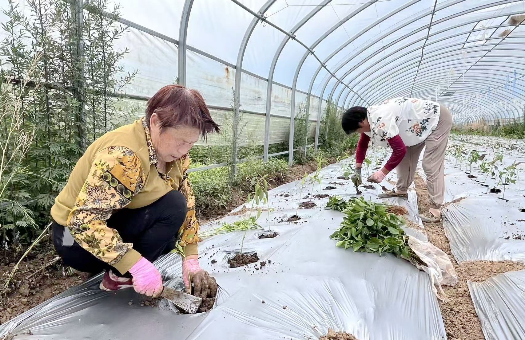 村民正在辣椒种植大棚内移栽辣椒苗