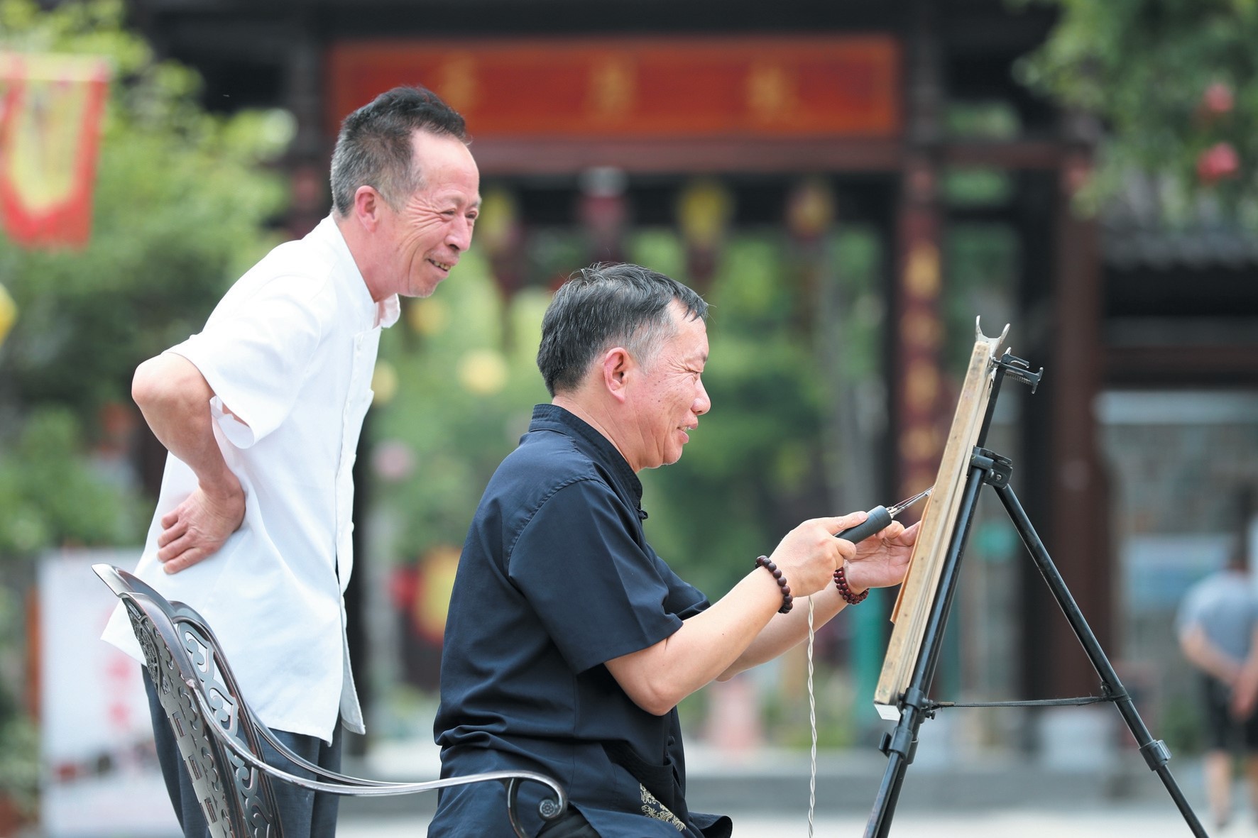 许光建精湛的烙画技艺引来游人赞叹。