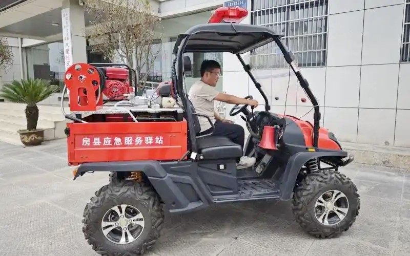 城关镇八里村应急服务驿站工作人员操作四轮越野车。