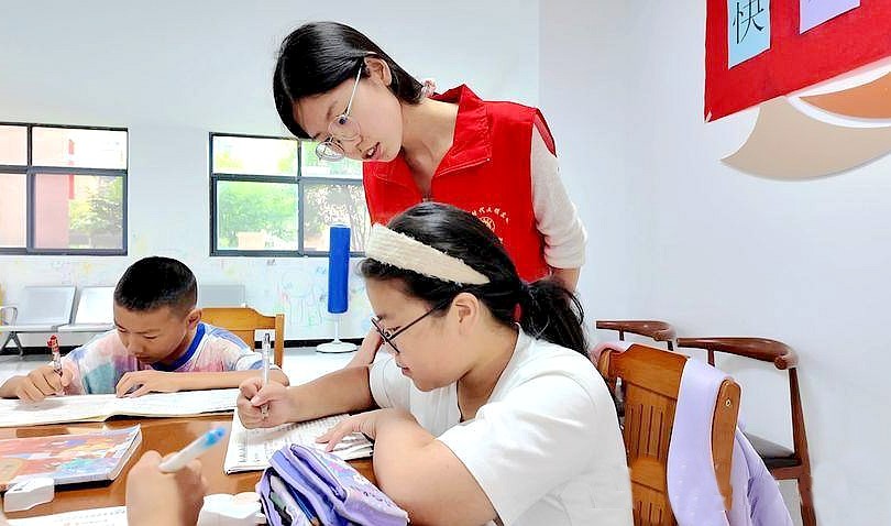 在城关镇的诗经小镇暑假爱心托管班,记者看到湖北文理学院的大三年级美术生志愿者李怡然正耐心地给学生讲解作业。