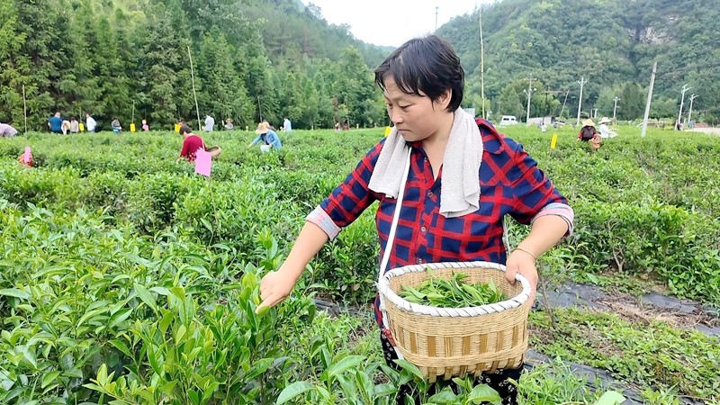 本报讯 (记者曹其琪实习生雷欣怡) 近日,在大木厂镇马进洞村50余亩示范茶园,茶农们挎着竹篓,手指翻飞间将鲜嫩的茶芽收入筐中。“我今天早上5点半下地,一天工作6个小时能摘50多斤鲜茶叶,可以挣100块钱。”村民张宽莲边采茶边说。