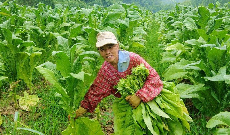 烟农在烟田里采摘成熟烟叶。