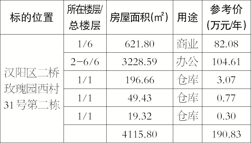 一、标的:武汉市汉阳区二桥玫瑰园西村31号第二栋房及部分无证建筑,合计4115.80平方米,房屋八年租赁经营权。
