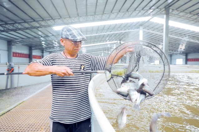 近日,在军店镇中村村的循环水高密度水产圈养基地,管理人员在投放饵料喂养鲈鱼,观察鲈鱼生长情况。该基地采用陆基高密度水产养殖方式,安装直径8米的养殖池128个,主要养殖经济价值高、市场热度高的鲈鱼,一年可出池两批次鱼,养殖效益翻倍。 (张启龙 摄)