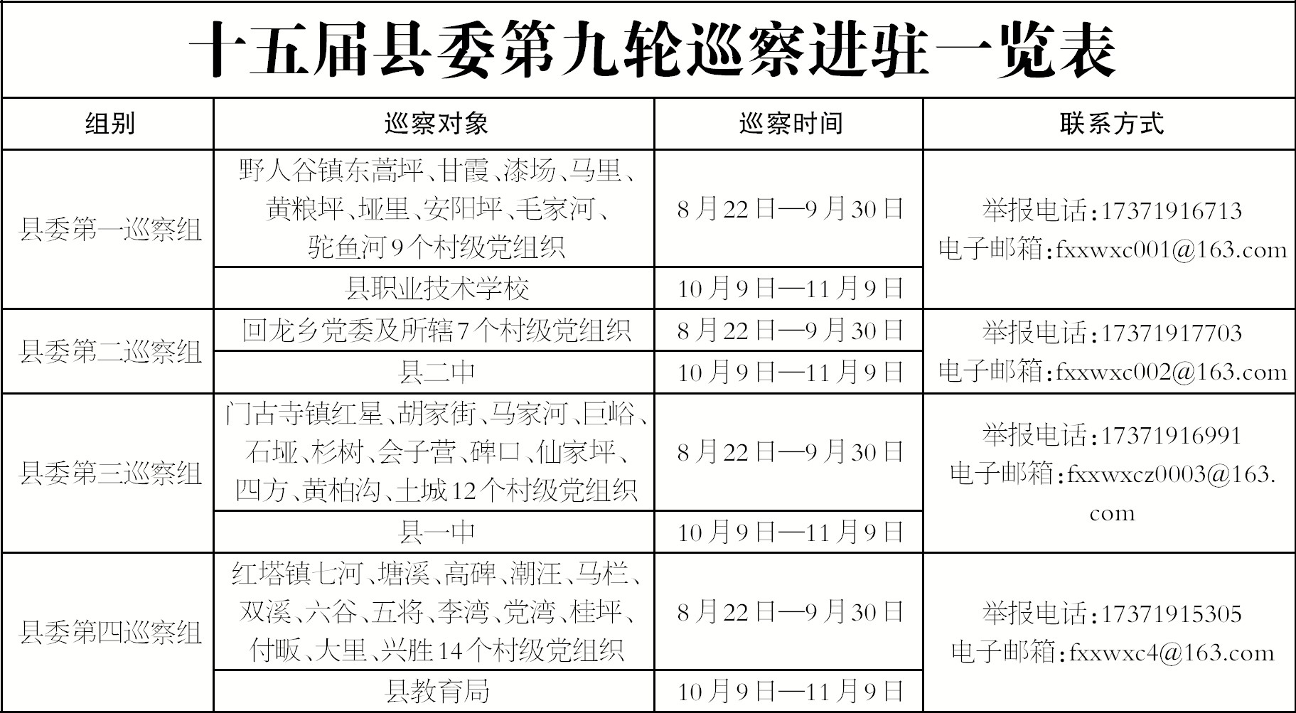 根据县委统一部署,本轮巡察对回龙乡党委及所辖7个村党组织、红塔镇所辖未巡的14个村党组织、门古寺镇所辖未巡的12个村党组织、野人谷镇所辖未巡的9个村党组织、县一中、县二中、县职业技术学校党组织开展政治巡察,对县教育局党组开展巡察“回头看”。