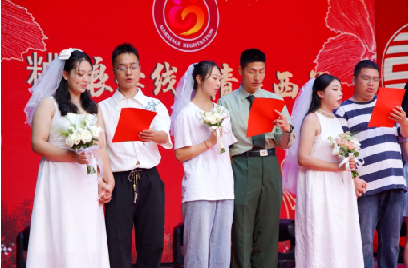 七夕佳节,县民政局将婚姻登记现场搬进西关印象景区,创新采用“婚姻登记+传统文化+旅游景区”模式,为20余对新人办理结婚登记,以群众喜闻乐见的形式宣传文明简约的婚嫁新风。图为新人集体宣读结婚誓言。