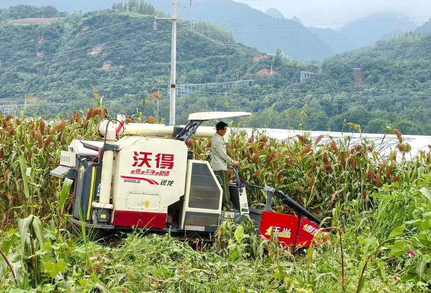 本报讯 (通讯员李定坤) 连日来,在中村村集体高粱基地里,农机人员正驾驶收割机忙着秋收。
