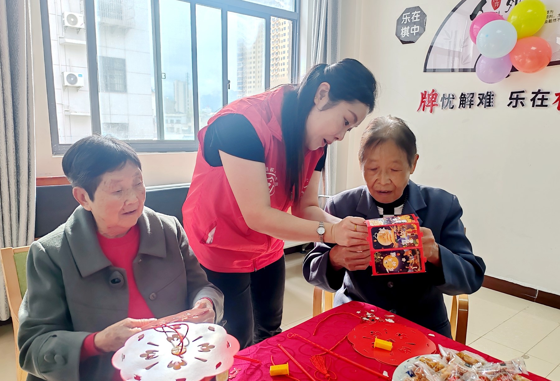 近日,县光荣院为在院老人开展公益理发、手工灯笼制作、趣味游戏等“便民、趣味、温情”为主题的双节庆祝活动,让院民们尽享佳节温馨。图为工作人员指导老人制作手工灯笼。 (刘杰 摄)
