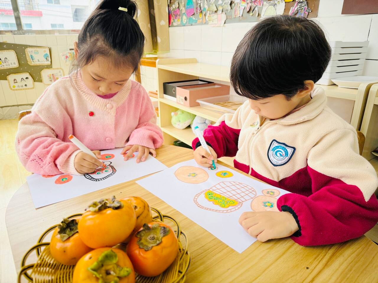 近日,县幼儿园组织幼儿通过听故事、跳手势舞、做手工、户外探索等方式了解霜降节气的历史、气候特点、文化习俗和民间活动,感知大自然的节奏和韵律,体会中华民族传统文化的魅力。图为幼儿通过观察,在纸上画柿子。(彭荣 彭招英 摄)
