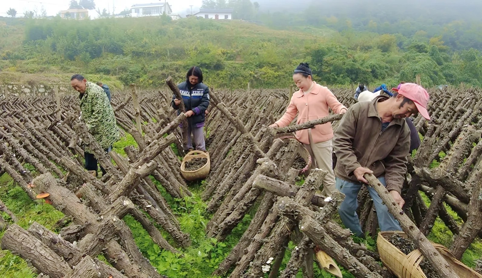 在黄杨村椴木食用菌基地,村民们穿梭其间,手指翻飞间,一朵朵肉厚形优的木耳便落入筐中。“今年收成还可以,这都摘到第四茬了,头三茬一共摘得有1300至1400斤,这一茬估计能摘700至800斤。”种植户王学龙说。