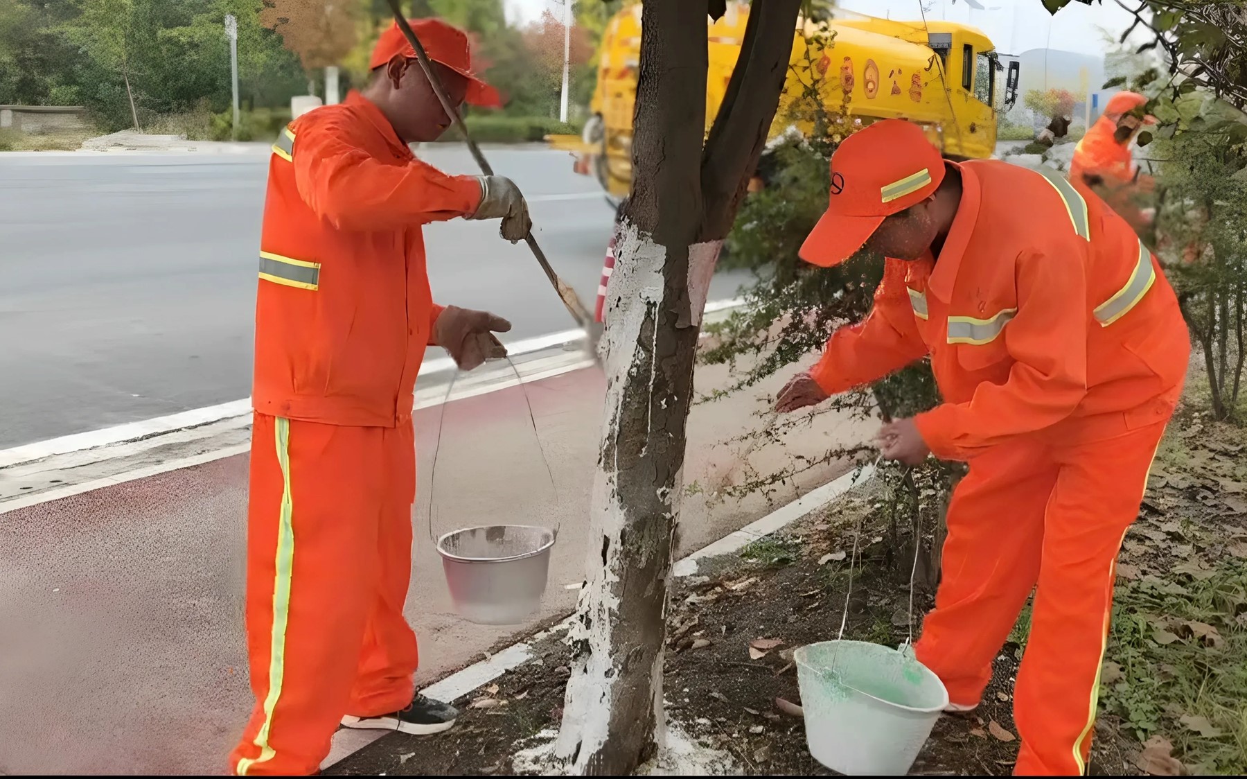 连日来,县公路养护部门组织人员开展秋季路树刷白工作, 筑牢秋冬公路安全防线、美化路域环境,以精细化养护守护道路通行与生态安全。图为工作人员对树木进行涂白。