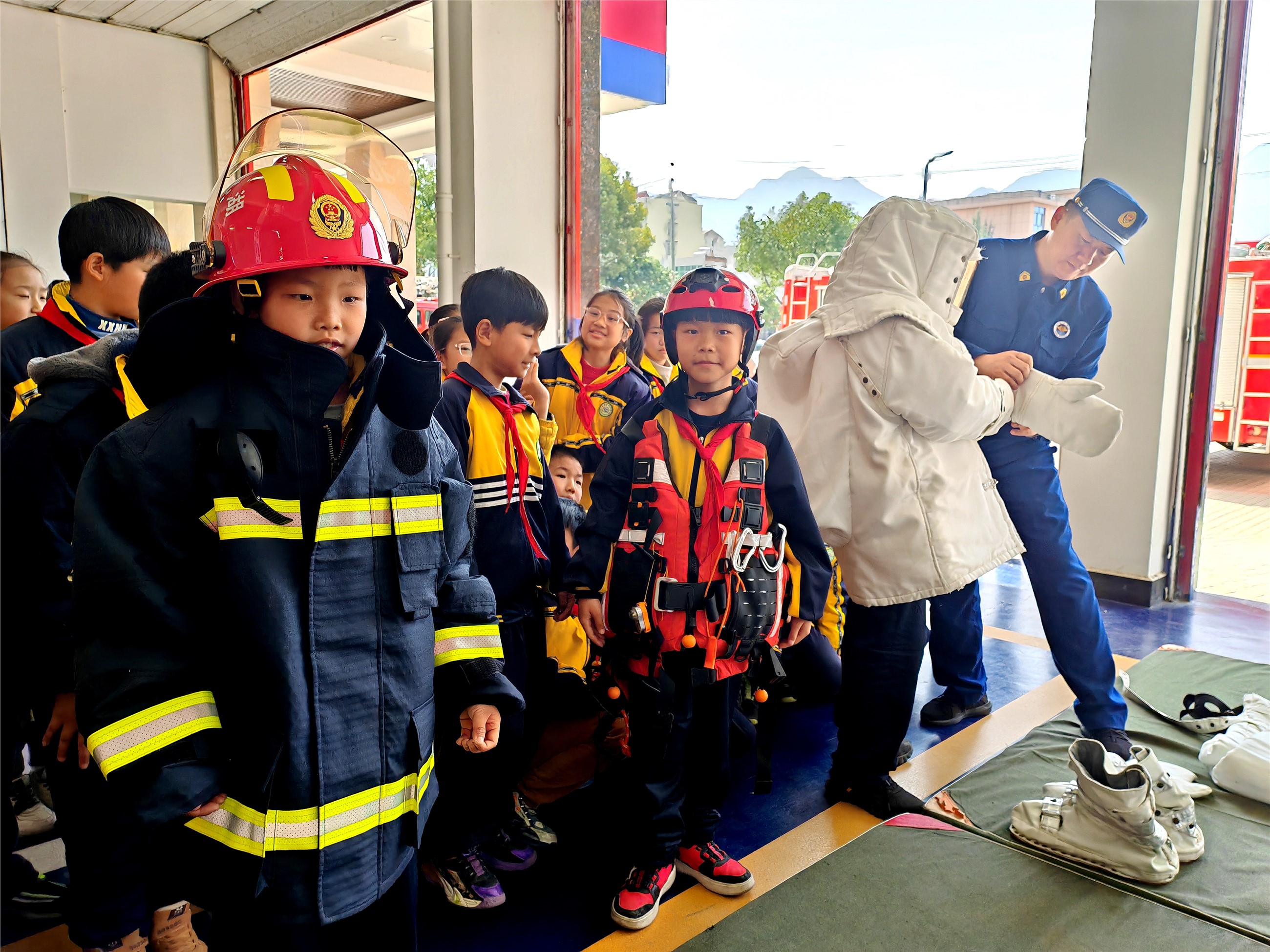 近日,东城小学学生在县消防救援大队体验特种防护装备的穿戴。连日来,该校扎实开展消防安全教育系列活动,通过组织学生绘制消防安全手抄报、聆听专题讲座等,进一步提升他们的消防安全意识与应急处置能力,筑牢校园安全防线。