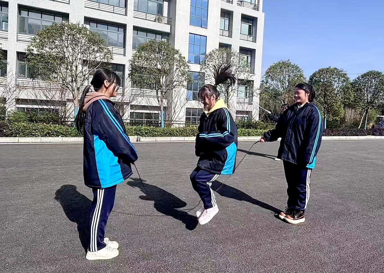 近日,县职业技术学校学生在大课间跳绳。近年来,该校深入推进阳光体育运动,根据学生需求,增设篮球、踢毽子等项目,激发学生的运动兴趣,让他们在锻炼中释放压力,增强他们的协调性与团队协作能力。