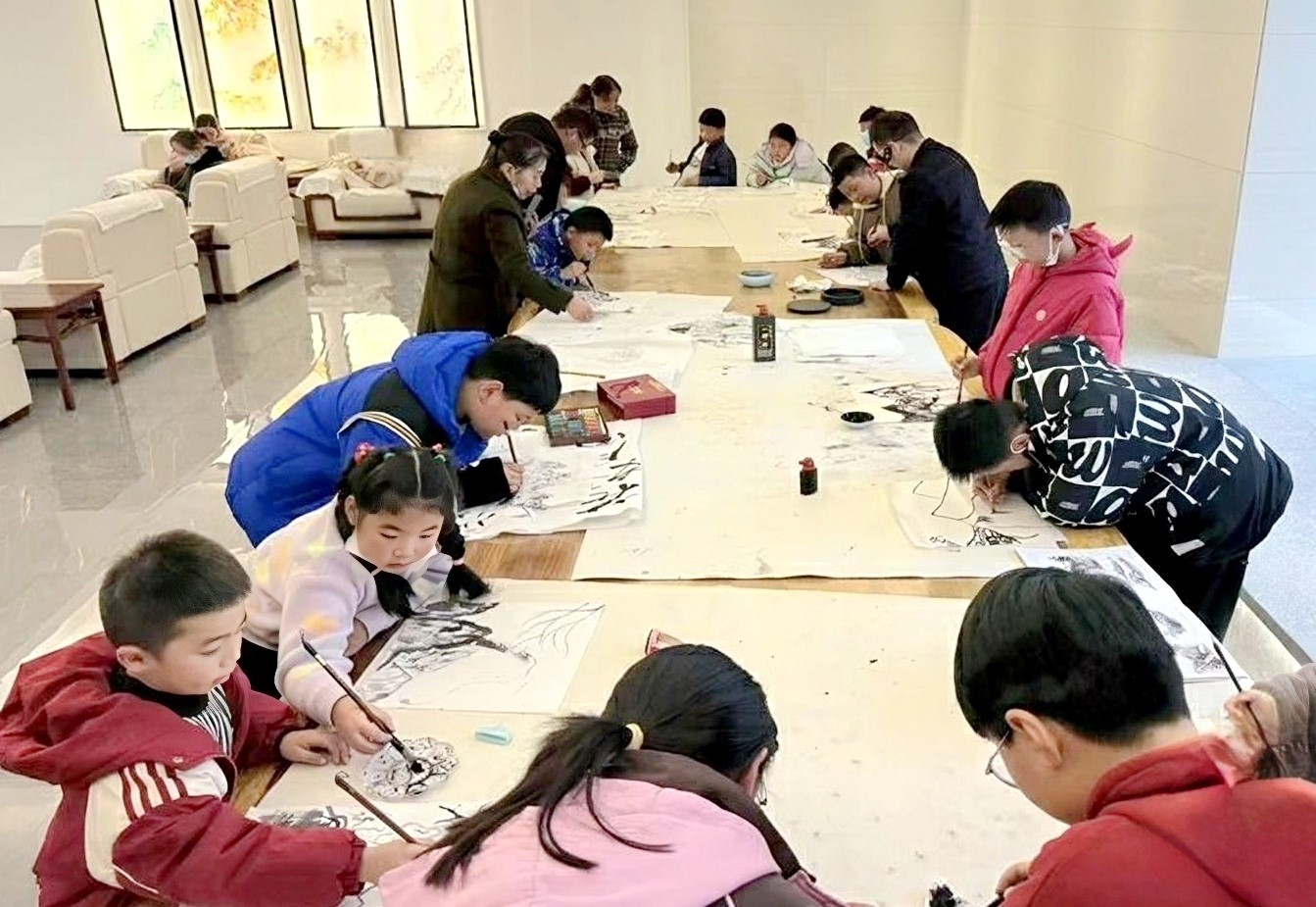 近日,县罗国士美术馆举办的“童墨绘丹青”系列活动圆满收官。本次活动集观展探秘、实践创作、互动分享于一体,打造沉浸式艺术盛宴,吸引数百名青少年踊跃参与。图为孩子们在专业老师的指导下进行绘画。 (彭宇欣 摄)