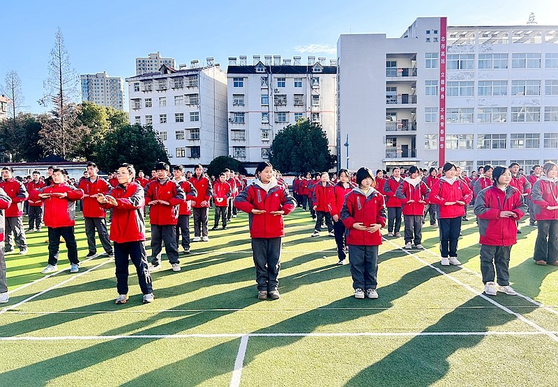 近日,县实验中学教联体举行太极展演活动。学生以整齐划一的动作、刚柔并济的招式展现太极文化的独特魅力,增强学生体魄与团队协作能力,促进他们身心健康全面发展。